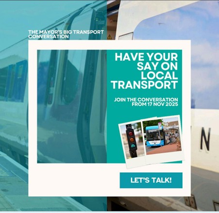 The Mayor’s Big Transport Conversation runs from 17 November 2025 to 8 February 2026. Your input will help shape a transport network that works for everyone, supports local businesses, and keeps our communities connected.